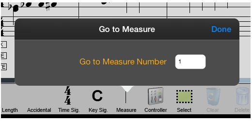 Enter the desired measure number and touch the "Done" button to position the display on that measure.