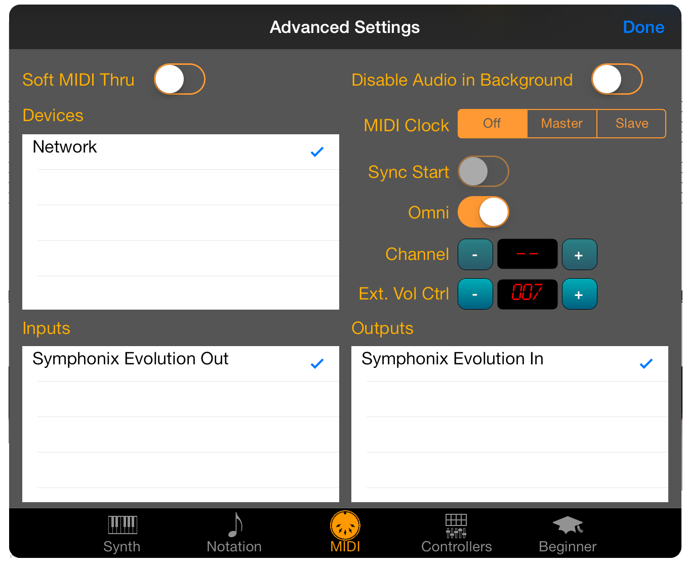 The MIDI tab controls the way in which Symphonix Evolution connects to MIDI