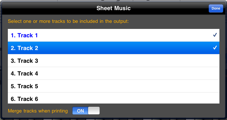 Symphonix Evolution is able to print arrangements with multiple tracks, each with its own staff and clef. Select the tracks to be included by touching them to tick or untick the selection, but note that the more tracks you include the harder it will be to fit the music on each page. It is recommended that no more than three tracks be chosen at a time.