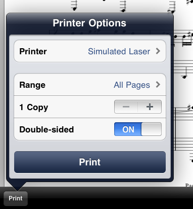 Use the Print button on the Print Preview screen to print the sheet music directly from the iPad to a supported printer, via AirPrint: