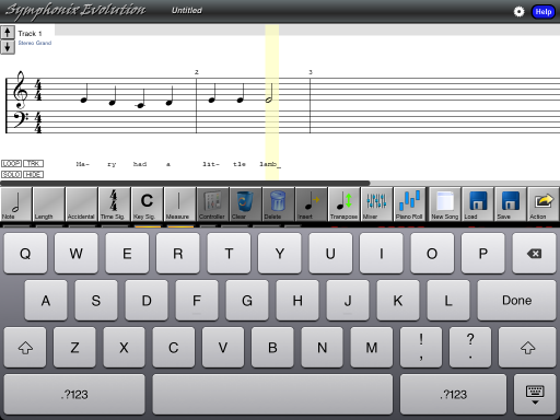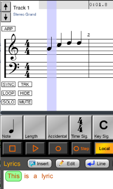 When in Lyric Mode, a purple selection bar is drawn on the music notation to indicate the current position of the lyric editor. The bottom part of the screen is where the actual lyrics are entered.