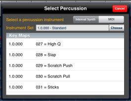 Any instrument in the Drum Kit family with at least one Percussion Map can be used as a rhythm source. Select whether the sound is "Internal" or "External" (MIDI), and choose an Instrument Set and percussion sound.