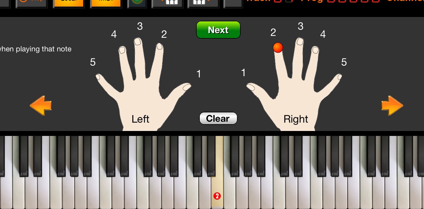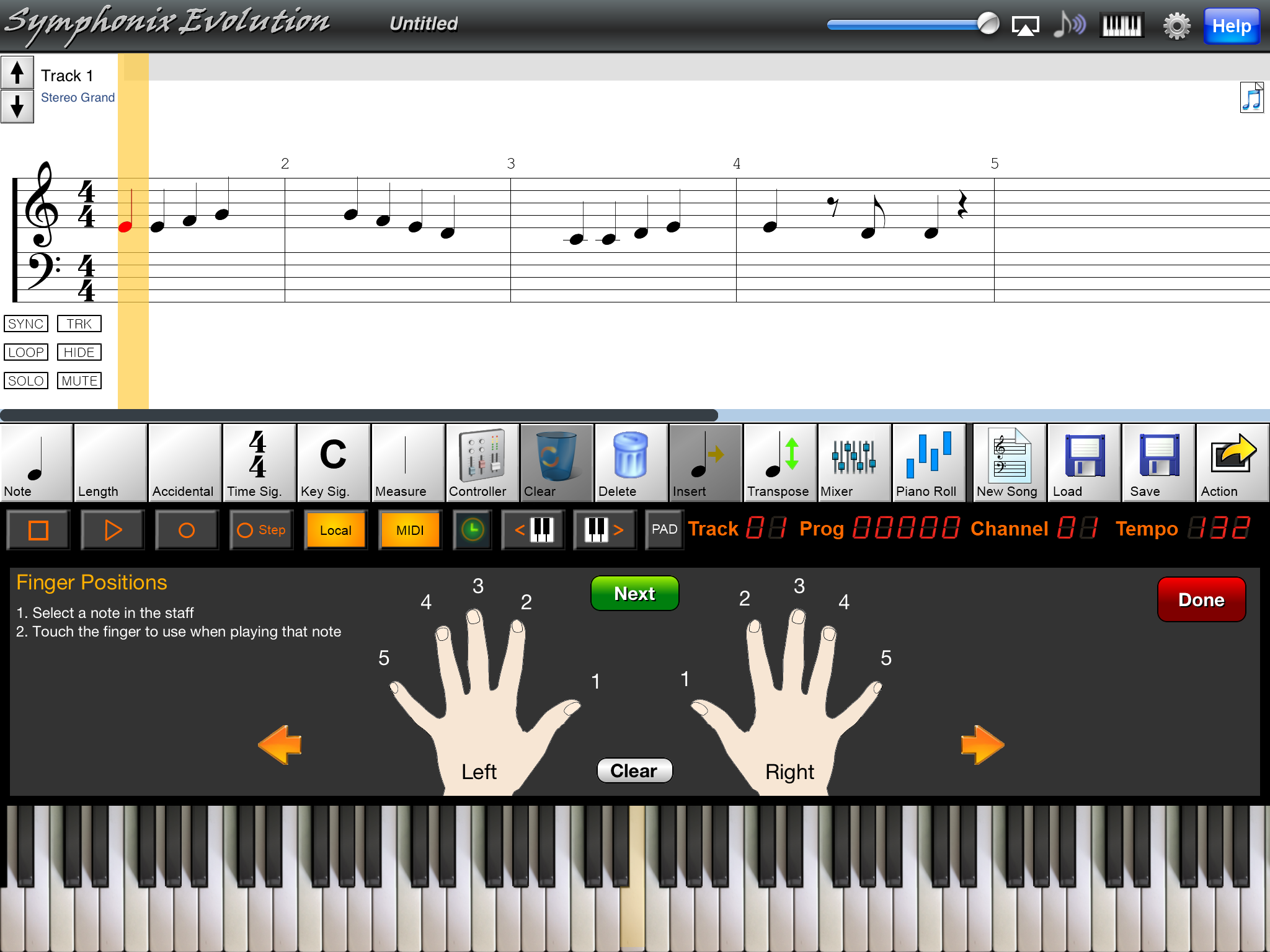 To enter a finger position against a note, first select it so it is highlighted in red and then touch the appropriate finger in the "Finger Positions" panel. A red indicator is drawn on the finger, and a number representing the finger is displayed on the Piano Keyboard below the "Finger Positions" panel.