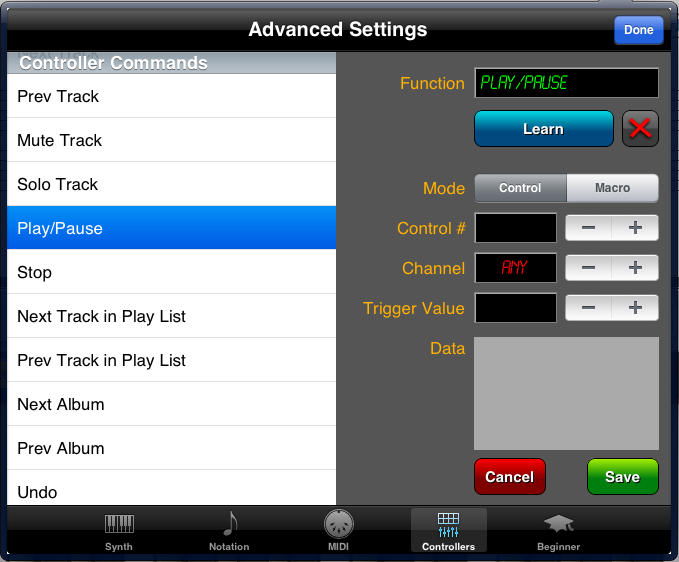 The MIDI Control function allows external devices to control functions in Symphonix Evolution. For example, a fader or knob control on an attached MIDI controller might be used to select a track or scroll through the song. Other apps supporting "virtual MIDI" are also supported.